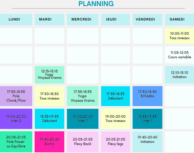 Notre école accueille des personnes de tous âges et de tous profils dans un esprit bienveillant et inclusif, où l’on apprend les bases en respectant le rythme de chacun·e. La salle, lumineuse et équipée de 12 barres et deux murs de miroirs, permet de travailler la posture et les airs en toute sécurité sous la supervision d’un coaching adapté. Les cours de pole dance sont conçus comme un vrai programme progressif : initiation, technique intermédiaire et avancée, flow & chorégraphie, floorwork, ainsi que des sessions spécifiques pour la force, la souplesse et le contrôle.
